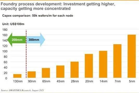 根据Digitimes在一篇文章中预估,如下图所示,一座每月可生产50000片90纳米晶圆的12英寸晶圆厂耗资约为24亿美元。一旦推进到28纳米,同等规格晶圆厂的成本将达到60亿美元,5纳米晶圆厂的成本更是高达160亿美元。