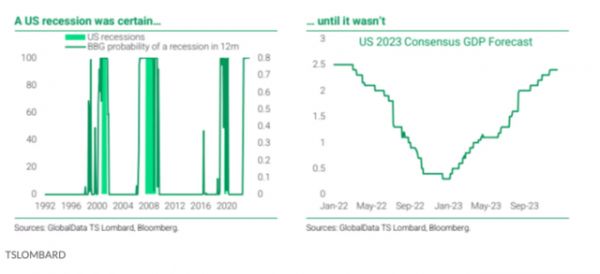 去年底,随着美联储一年加息425基点、实际利率步入限制性区间、美债收益率曲线持续倒挂,市场共识认为衰退概率高达70%。彭博经济模型预测显示,美国衰退几乎是板上钉钉的事。在此之后,美国衰退的声音越来越大,预测衰退的概率越来越高。