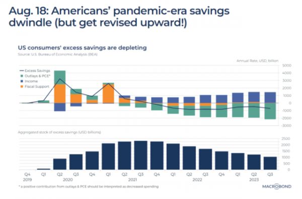 首先,借款人尚不必开始支付较高的利率,他们已经锁定了之前较低的利率。其次,在失业率较低的一年里,美国政府疯狂印钞,财政赤字飙升,而美国消费者仍有超额储蓄。旧金山联储本来认为,消费者将在今年第三季度耗尽超额储蓄,但随后在11月进行了修订,预计仍有4300亿美元的超额储蓄,直到2024年上半年才会被用完。