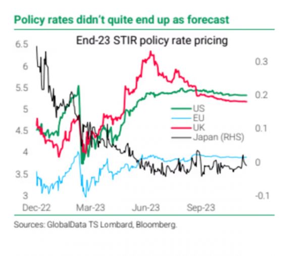 年初市场定价2023年将大幅降息,但在大多数情况下,经济韧性令主要央行比市场最初预期的更加鹰派。美联储本身的利率峰值达到了5.5%,而2022年的预期为5%,欧洲央行的利率达到了4%,而预期为3%。