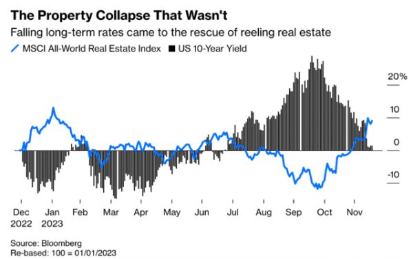 一直以来,10年期收益率都是房地产的反向指标:随着10月份债券收益率飙升,全球房地产股票大幅下跌。从那之后地产股开始回升,全年涨幅约为10%。