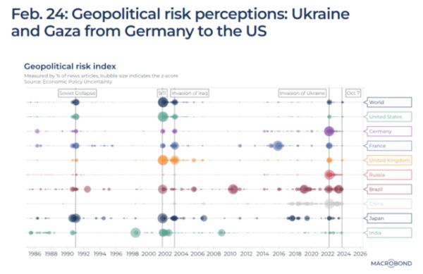 整体来看,近年来的地缘政治冲突并没有对经济或市场产生重大影响,下图显示了不同国家的地缘政治风险。可以看到的是,对美国来说,9/11事件之前和之后的所有事件都黯然失色。对德国来说,最大的事件是俄乌冲突,这被视为一个变革性的时刻,此前德国极其依赖于俄罗斯能源。
