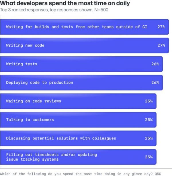 我的意思是说,即便 AI 帮助程序员写得再快,这个阶段也只是软件生命周期中的一部分而已。早有相关的数据统计,程序员日常的工作,只有 30% 的时间是在编写代码,而更多的时间是在尝试理解他们要实现什么功能,以及设计和学习新技能上。