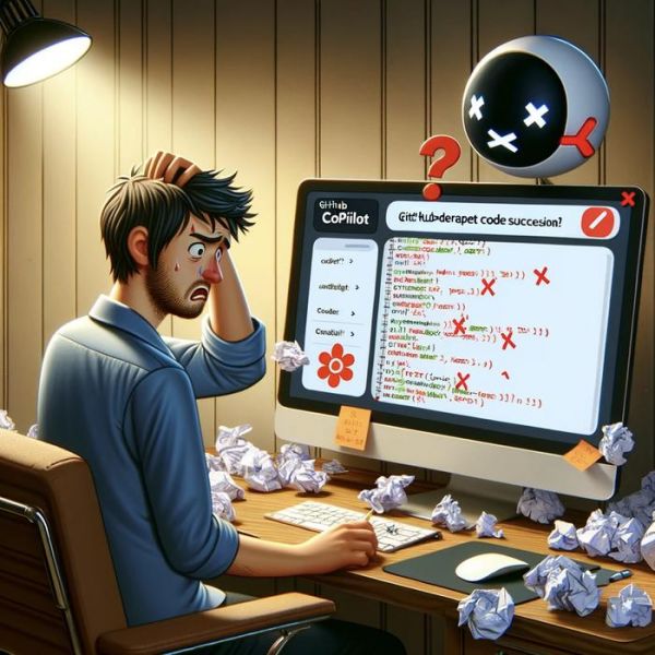 (prompt:A programmer is sitting at a computer desk, looking confused and frustrated. The computer screen shows a code editor with a pop-up window of GitHub Copilot suggesting incorrect code, symbolized by red error indicators and crossed-out lines in the code. The programmer is scratching their head, surrounded by crumpled paper, indicating multiple failed attempts. The scene conveys a sense of challenge and confusion due to the reliance on incorrect AI-generated code suggestions, leading to quality issues in software development. The room is cluttered, reflecting the chaotic situation. )