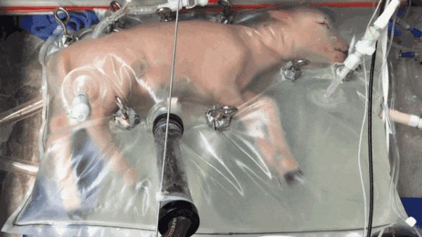 该研究小组的系统在工作时会将极早早产儿放入他们所说的“生物袋”(Biobag)中,其中填充了一种模拟羊水的富含电解质的液体。外科医生会将脐带中的血管连接到一个在体外为血液充氧的系统上。胎儿心脏仍然会像在自然子宫中一样泵血。