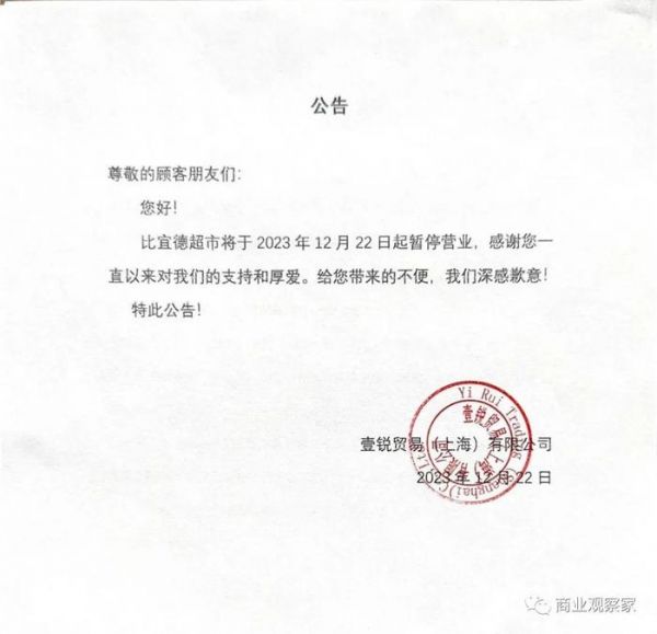 已在上海运营超过7年的硬折扣零售商——比宜德宣布关停,其母公司壹锐贸易(上海)有限公司昨日夜间发布停业公告,称比宜德超市将于2023年12月22日起暂停营业。