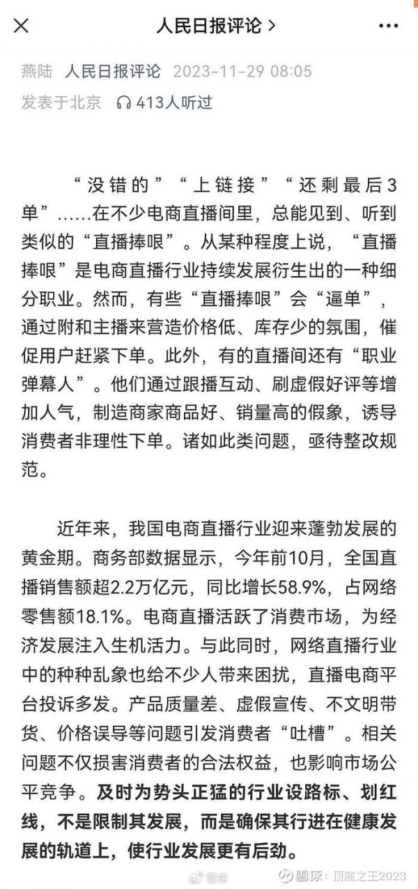 11月29日,人民日报时评发表了一篇《直播带货,规范方能长远》文章。