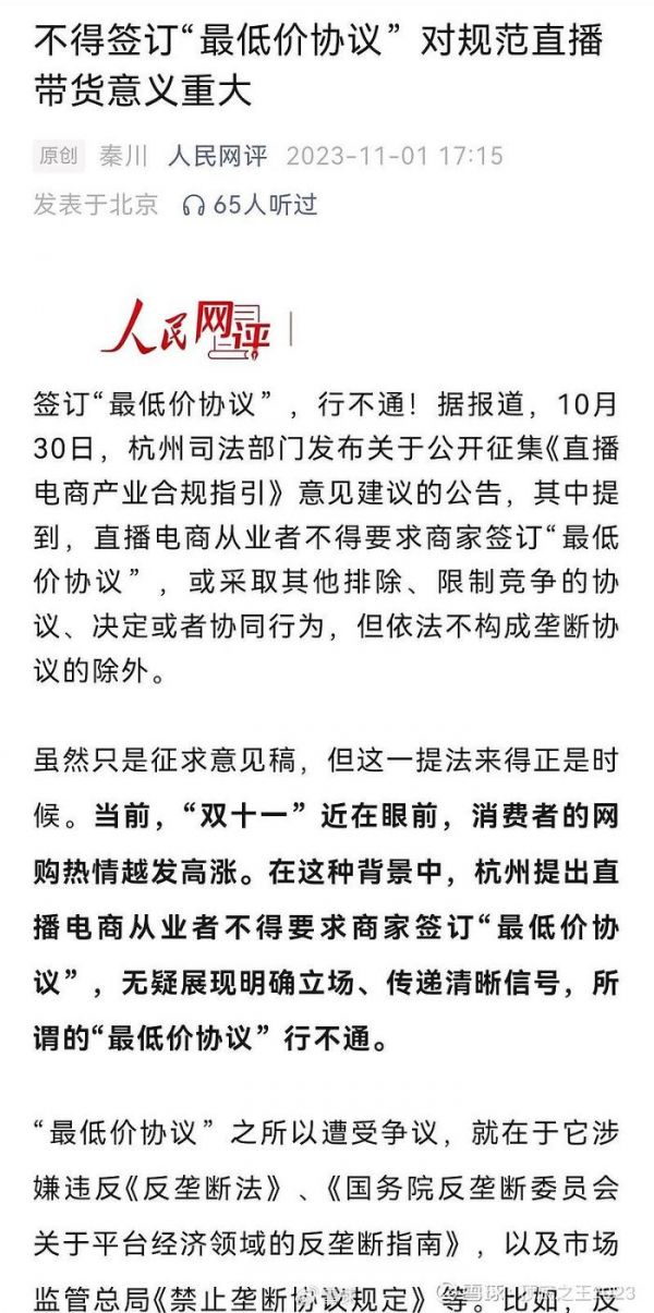11月1日,人民网评发表了一篇《不得签订“最低价协议”对规范直播带货意义重大》文章。