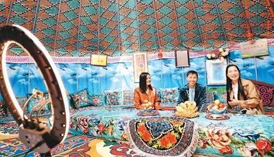 新疆维吾尔自治区昌吉市一名农牧民(中)在直播卖货。梁宏涛摄(人民视觉)
