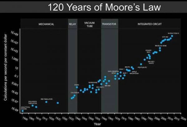 这不太可能吧,一定是我们的假设有问题,这时候,耳边飘来一句话:“用一个美元所能买到的电脑性能,每隔18~24个月翻两番”。