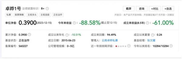 年内跌幅近九成的还有卓晔1号,这只基金为股票多头策略,当前净值还剩0.39,今年以来收益率为-88.58%,自2015年成立以来收益率为-61%。也曾有过一年涨三倍的辉煌过往,却在2022年、2023年连续遭遇巨幅回撤。