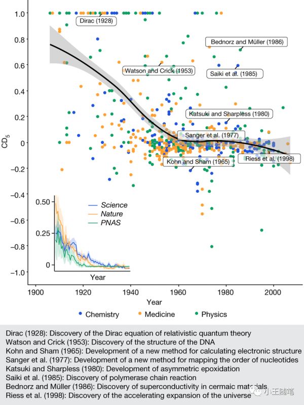 从数据上看,诺贝尔奖的获奖工作的颠覆性也是随时间下降的。