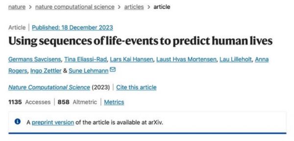 1. 12月底,《自然-计算科学》发表研究,揭示丹麦科技大学国际研究团队的新产品——“Life2vec”的预报原理。它可以直接预测人的死亡率,准确率高达78%,据称是目前市面上准确度最高的预测方式。团队使用七年间超过230万名35至65岁丹麦人群的数据,分析个人生命历程中的事件序列,预测接下来最有可能发生的事情。