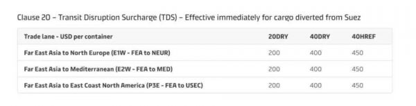 马士基宣布增收的运输中断附加费部分收费标准(图源:网络截图)