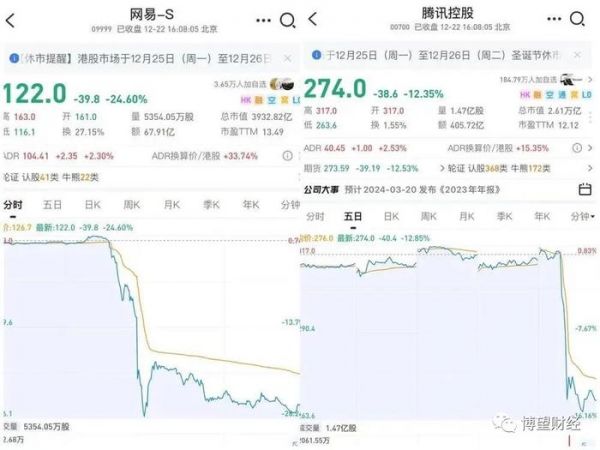 腾讯股价单日跌幅达 12.35%,市值蒸发约 3670 亿港币,网易股价单日跌幅高达 24.6%,市值蒸发约 1283 亿港币,两者合计跌超 4900 亿港元(折合人民币约4500亿元)。