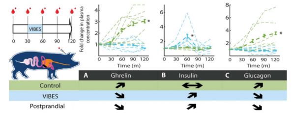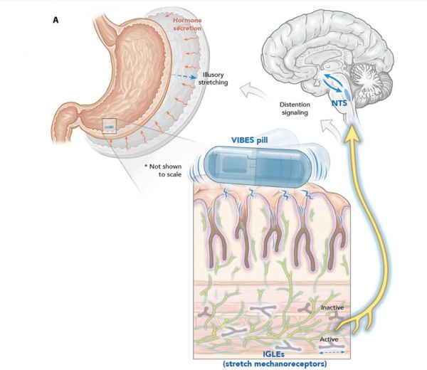 在一项针对动物的研究中,研究人员表明,一旦药丸开始振动,它就会激活机械感受器,机械感受器通过刺激迷走神经向大脑发送信号。研究人员跟踪了设备振动期间的激素水平,发现它们反映了饭后激素释放模式,即使动物禁食也是如此。