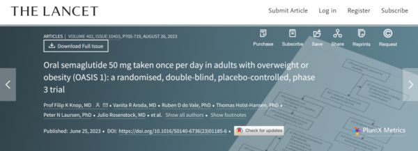 《柳叶刀》(The Lancet)上发表的 OASIS 1 试验结果显示,每日一次 50 毫克的司美格鲁肽口服治疗可显著降低超重或肥胖症成年人(未患有 2 型糖尿病)的体重(治疗 68 周平均减轻15.1%)。