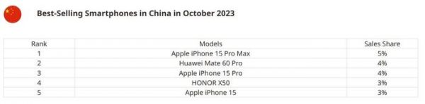 IT之家 12 月 26 日消息,中国作为全球最大的智能手机市场,一直是各大手机厂商的必争之地。据市场研究机构 Counterpoint Research 的最新数据,2023 年 10 月,中国最畅销的智能手机并非来自华为 Mate 60 系列,而是苹果的 iPhone 15 Pro Max,其市场份额高达 5%。
