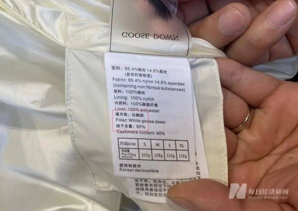 羽绒服上标注的充绒量等信息 图片来源:每经记者 舒冬妮 摄