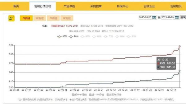 据羽绒金网数据,近半年羽绒行情呈现上涨趋势。截至12月22日,“95%规格白鹅绒”价格为92.65万元/吨,“50%规格白鹅绒”为41.41万元/吨,“95%规格白鸭绒”为46.58万元/吨,“50%规格白鸭绒”为19.19万元/吨。
