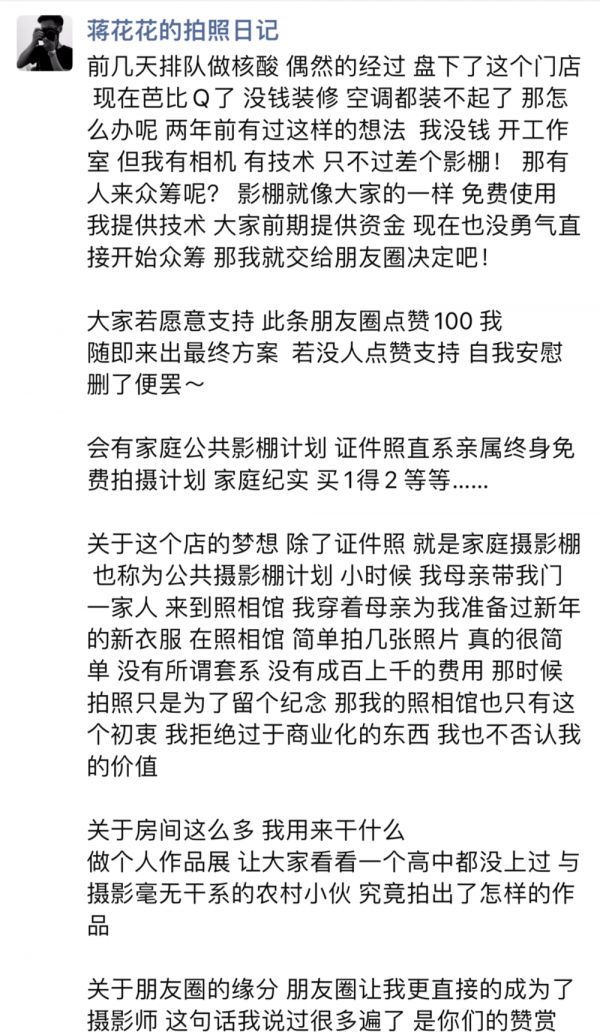 为了升级照相馆,他发起了一个众筹——只要有人花500块钱,就可以获得三年内一次跟拍的服务;花1000块,可以在5年内兑现一次服务;如果花5000块,服务兑换时间就是永久。通过朋友圈和老顾客群的众筹,花花获得了5万块左右的启动资金。