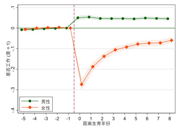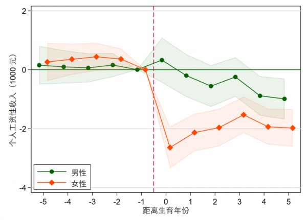 相比之下,男性的劳动供给在生育之后立即有所上升。在一些文献中,有时会将其称为“生育奖赏”。我想这对爸爸们而言也不能称之为奖赏,毕竟有了孩子之后,爸爸们需要加倍努力工作才能为家庭和孩子创造更好的条件。爸爸和妈妈都不容易。