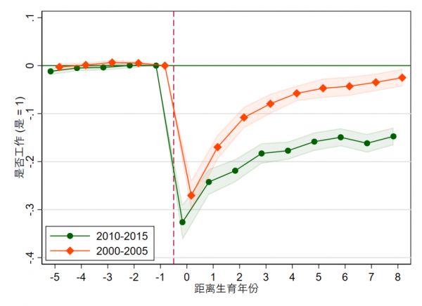 图2主要是关于女性的分析。从图中可以看出,生育之前,无论是2000年~2005年,还是2010年~2015年,工作方面的变化趋势几乎一致,生育当年劳动供给的下降幅度也类似。在生育后的恢复过程中,早些年生育的女性通过努力,其劳动供给可以恢复到生育前的水平;但晚些年生育的女性很难回到生育前的水平。这可能反映出2000年~2015年就业环境的变化,尽管女性很努力,但仍不得不因为生育而在工作上做出很大牺牲。这就是经济学概念上生育的“经济成本”。对今天的中国女性而言,这是很大的一项成本。