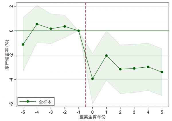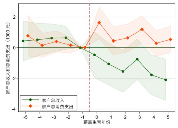 为生育小孩,一些人不得不放弃工作。不工作就没有收入,家户收入自然也会下降,而孩子出生后家庭的总消费可能因育儿开销的提高而增加。图5展示的是生育孩子前后,家户总收入和总消费的变化情况。可以看出,生育小孩之前,总收入和总消费基本持平,但在生育后这两项指标开始分叉,消费上升,收入下降。这意味着家户储蓄率也有显著的下降。总体看,家庭很难在生育子女后的几年内增加储蓄。