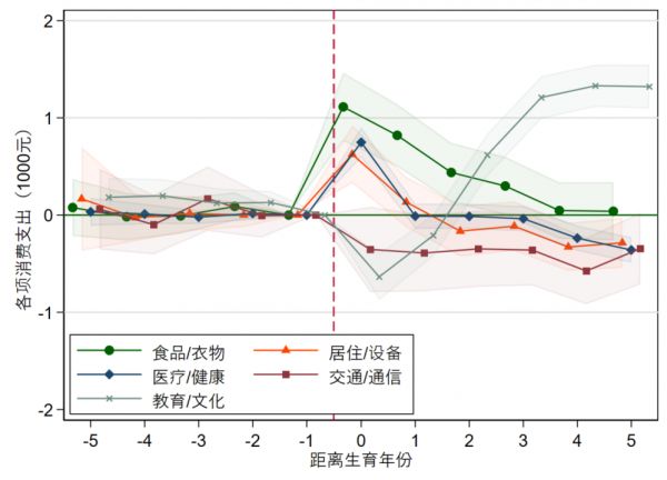 图7展示的消费动态上升的分类变化情况。可以看出,在生育当年,消费的上升主要集中在食品、衣物、医疗健康、居住设备等方面,教育文化和交通通信方面的消费下降。随着孩子慢慢长大,食品消费逐年下降,居住设备、医疗健康方面的消费也逐渐恢复到之前的水平。教育文化消费开始上升,这可能是托儿所等方面的费用开始上升。图7只展示了孩子五岁之前家庭的消费变化情况,进入小学之后的消费没有包含进来。