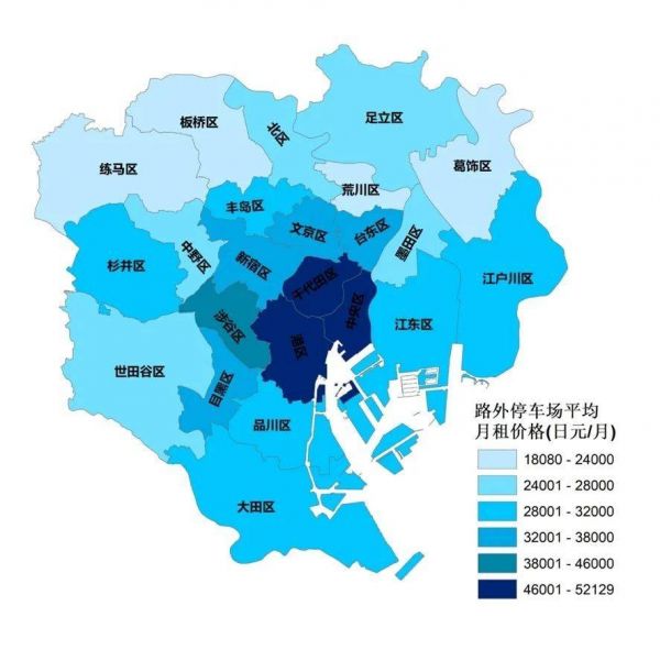 高昂的停车价格也是东京的一大“特色”。东京对停车价格上限没有要求,企业通过市场供需关系自由调节。东京的停车价格呈明显的差异化分布,东京都23区部的停车价格从中央四区向外逐渐降低;在供需关系最为紧张的中心区,停车价格非常昂贵,中央区车位的平均月租价格更是高达52129日元(约2575人民币)。东京居民一般通过这种按月租赁固定车位的方式获得“自备车库”。