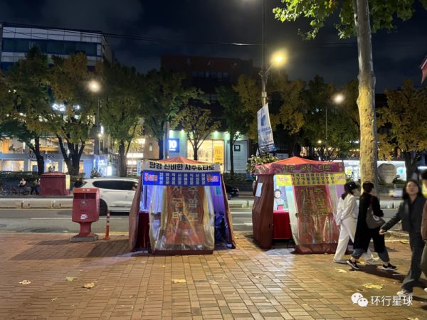 韩国大学附近的算命小棚子,上面写的分别是八字、批姻缘、塔罗。图:安琪