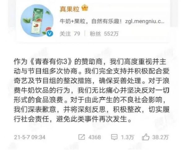 如此浪费的行为,一经曝出,迅速登上热搜,引发热议,5月9日,爱奇艺《青春有你3》节目组宣布决定终止节目录制,取消决赛。作为赞助商的蒙牛“花果轻乳”也被多家官媒点名批评,这一事件不仅正式终结了奶企们引领秀综打投的时代,也对品牌IP造成了难以挽回的负面影响。