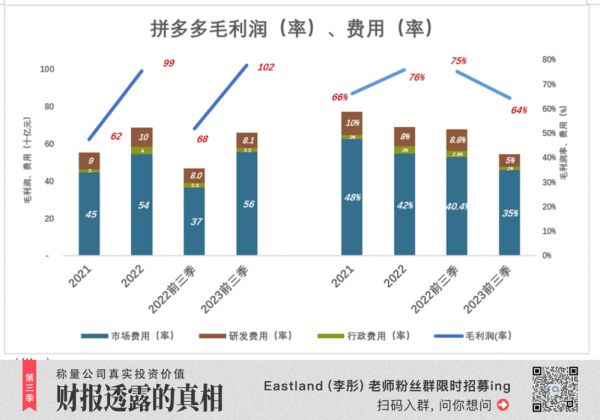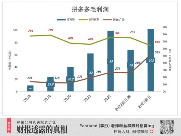 2023年前三季度,毛利润率降低11个百分点、至64%,而佣金收入暴涨186%,“以价换量”策略再次“上线”,结果是营收增长75%,毛利润增长50%、达到1021亿。