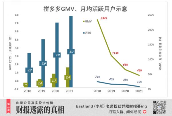 2021年,GMV达2.4万亿、同比增长46%,月均活跃用户8.7亿、同比增速仅为10%;