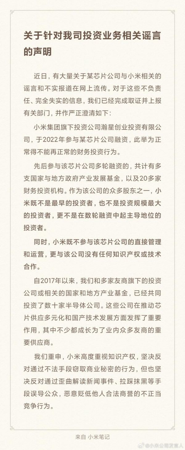 同时,小米强调,其既不参与该芯片公司的直接管理和运营,更与该公司没有任何知识产权或技术合作。