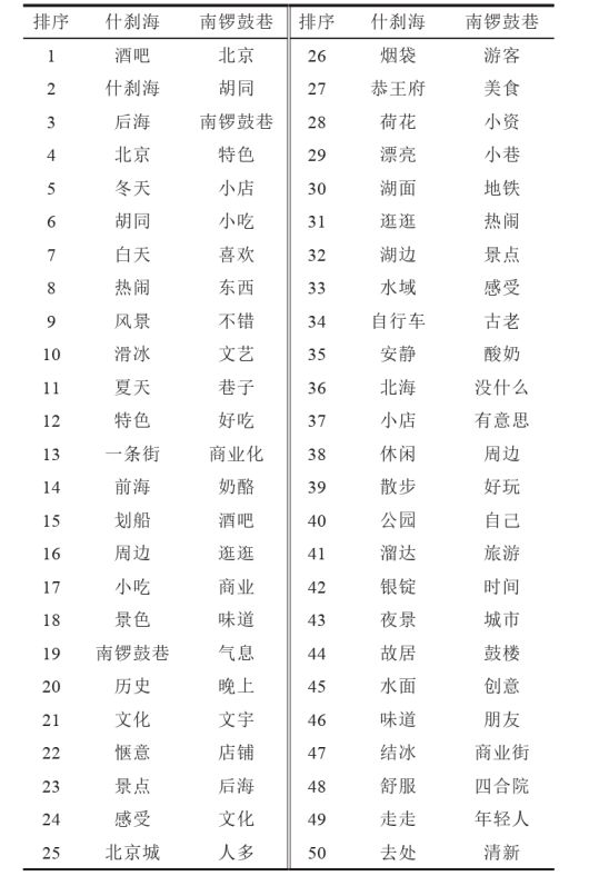 截止至2017年6月16日,马蜂窝网站点评文本前50的有效高频词,图片摘自《“真实性”理论语境下的历史街区研究》一文