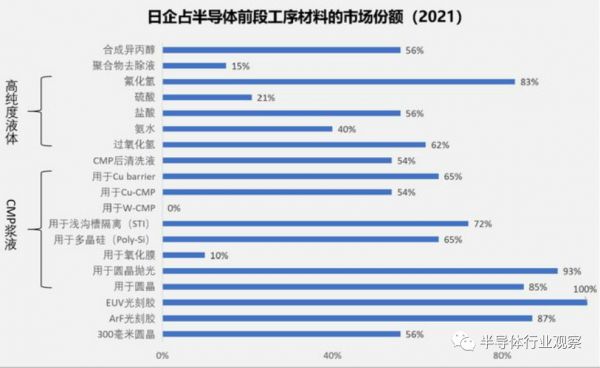 据了解,芯片制造涉及19种关键材料,且多数都具有较高技术壁垒,而日本企业在其中14种关键材料中占据了全球超过50%的市场份额,在其余几种材料的龙头企业中也不乏日本企业的身影。