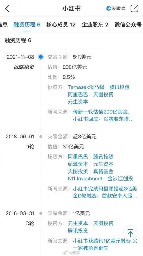 据天眼查显示,截至2021年,小红书已进行6轮融资,累计融资额超9亿美元,投后估值超过200亿美元。最后一轮融资由淡马锡和腾讯、阿里领投,天图投资、元生资本等跟投。