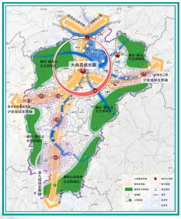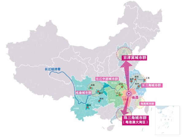 “吴头楚尾,粤户闽庭”,说的是江西的区位,背靠长江中游城市群,且是唯一与长三角、珠三角、闽三角毗邻的省份。
