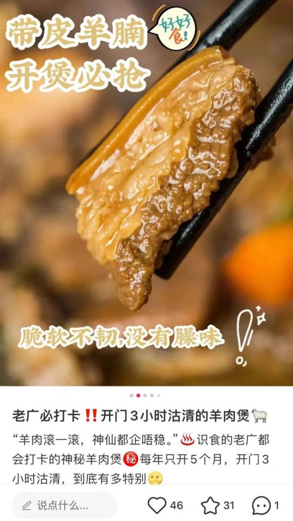 △带羊皮的肉和红焖羊肉煲称得上“天作之合”,许多人判断一家羊肉煲店值不值得再去,就看店家舍不舍得多给带皮羊腩。(图/小红书截图)