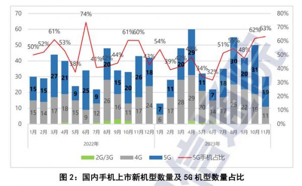 ▲ 图源中国信通院报告2023 年 11 月,国内手机上市新机型 30 款,同比下降 30.2%,其中 5G 手机 19 款,同比下降 26.9%,占同期手机上市新机型数量的 63.3%。