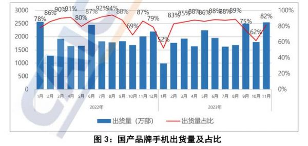 2023 年 1-11 月,国产品牌手机出货量累计 2.07 亿部,与上年同期基本持平,占同期手机出货量的 79.2%;上市新机型累计 380 款,同比增长 10.1%,占同期手机上市新机型数量的 91.6%。