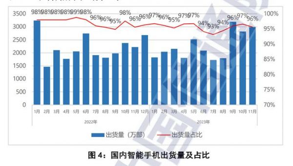 2023 年 11 月,国内智能手机出货量 2985.6 万部,同比增长 34.4%,占同期手机出货量的 95.7%。2023 年 1-11 月,国内智能手机出货量 2.50 亿部,同比增长 5.4%,占同期手机出货量的 95.7%。