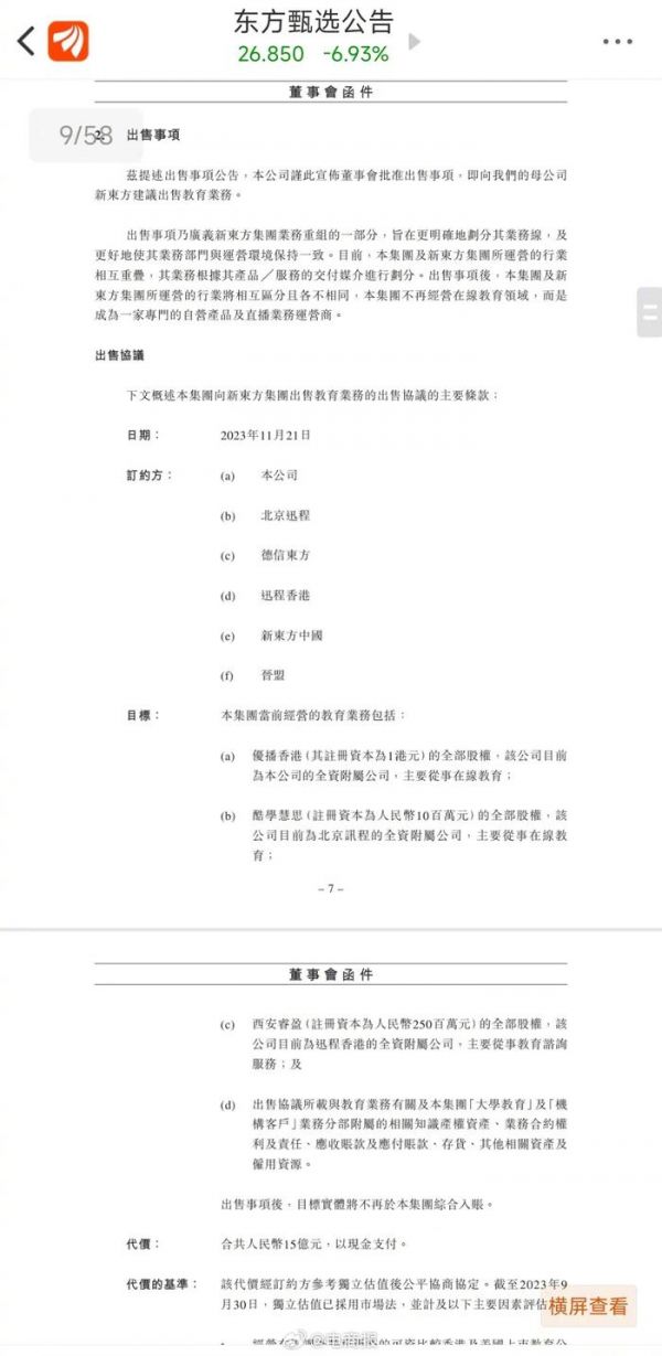 东方甄选15亿元向母公司出售教育业务……