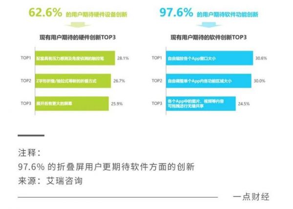 艾瑞咨询发布的《2023年中国折叠屏手机用户洞察报告》就显示,97.6%的折叠屏手机现有用户更期待软件方面的创新,重点在于对手机界面APP的灵活调控,如APP窗口大小的自由缩放、APP内各功能区域大小的自由调整和APP之间图片、视频拖拽共享等操作。