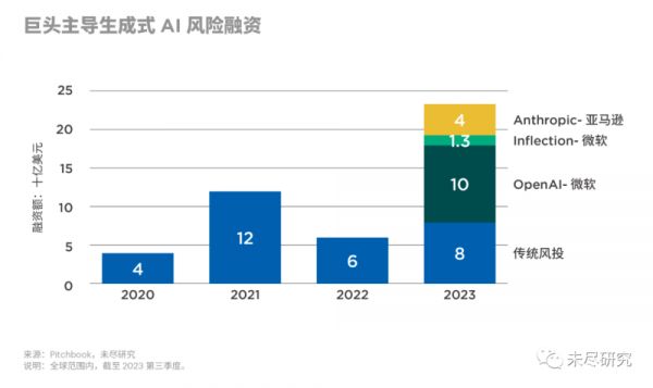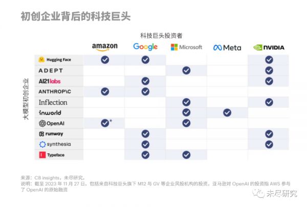 巨头不仅砸下巨资进行前沿技术开发和新产品研发,打造先进的企业IT系统和技术平台,它们还投资、收购初创企业。2023年,对生成式AI的投资,微软、谷歌、亚马逊、英伟达等几家大型科技巨头对大模型初创企业的投资,金额上远远超过了独立的风险投资机构。