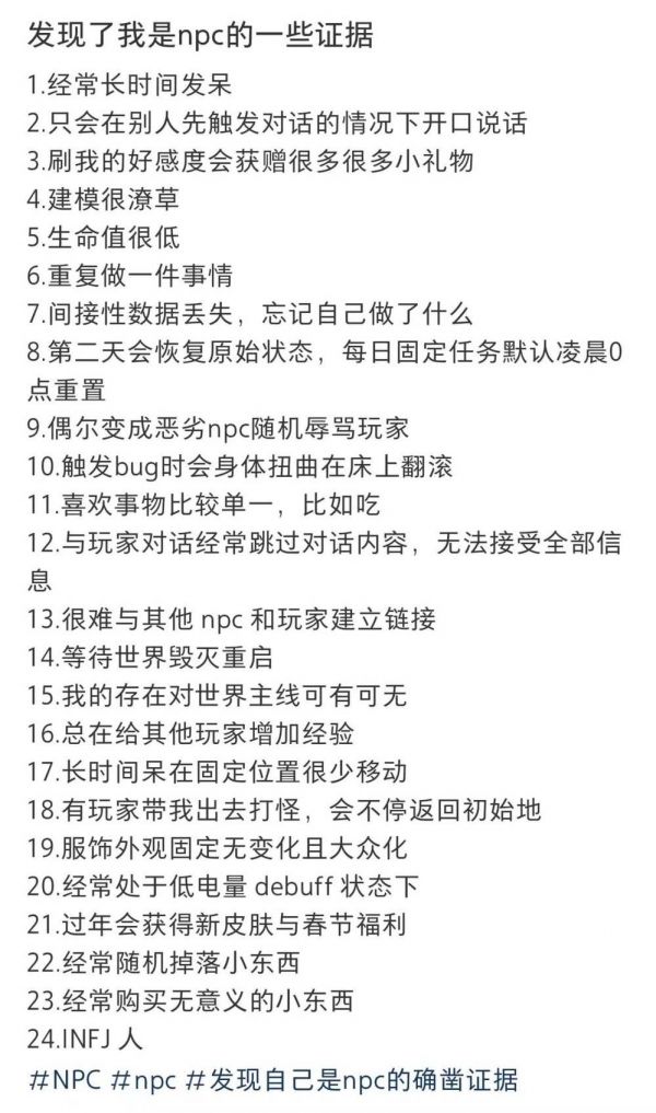 调侃之余,不少网友还在网络平台上发布了确认自己是NPC的多个评价标准。看过后,不少网友戏称“我正式被确诊为NPC了”。