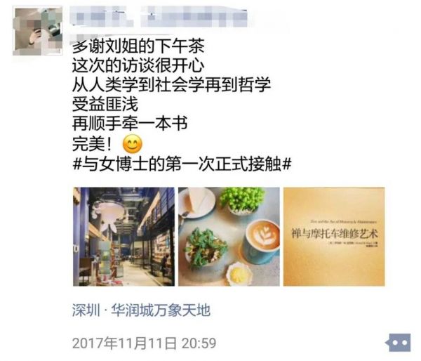 图片中是2017年我们第一次访谈当天他发的一条朋友圈,说这是自己第一次接触女博士,从人类学聊到社会学,再到哲学,受益匪浅。当然这条朋友圈完全可以解读成,我变成了他高价值展示的工具人。