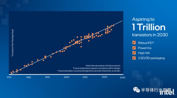 首先看英特尔,作为一家把持芯片制造技术多年的半导体巨头,英特尔在单芯片集成上有着丰富的经验。来到封装领域也不例外。值得一提的是,在去年的IEDM上,英特尔就率先提出了2030 年打造包含 1 万亿个晶体管的处理器的雄心。