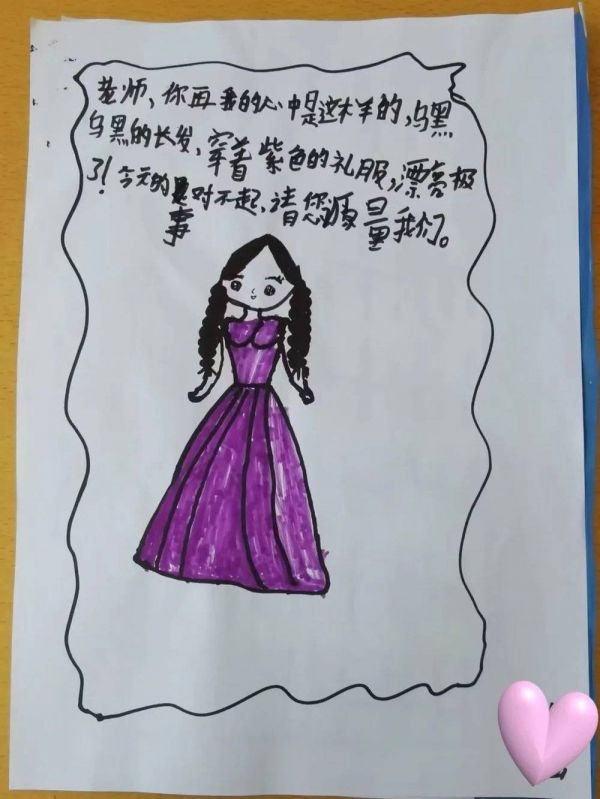 逃离了混乱的课堂的悦轩,在当天下午收到一沓画纸,是学生们为了道歉给她画的画。一位女同学画了自己心目中的她——一头乌黑的长发,穿着紫色的礼服裙。还有同学因为不知道她最喜欢的颜色,因此决定把图案涂成五颜六色的。
